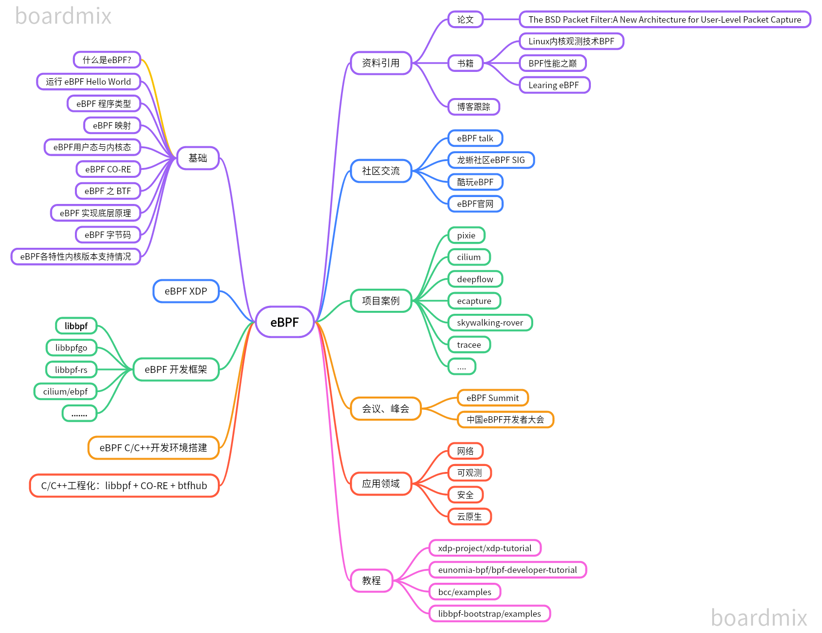 刚好,绘制了一张自己 eBPF 学习路线的思维导图,因为之前 XDP 没有怎么关注过,交流群里的大佬经常提及,所以我单独列出来,准备下阶段学习。其他,再分散的话,那就要聚焦到具体的应用场景了,网络、安全(特别是云原生安全)、可观测、跟踪等等,阅读开源项目应该是最好的实践方法。